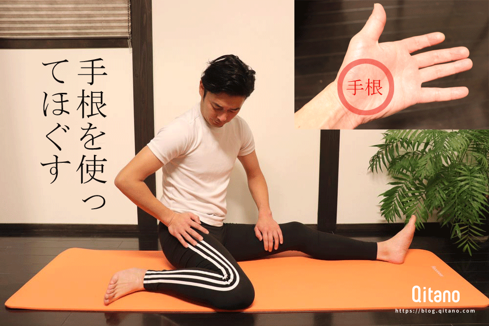 | ポイント | いた気持ちい程度の強さでほぐしましょう。 このハードルの姿勢が取れない人は、股関節が非常に硬いと認識した方がいいでしょう。 股関節の柔軟性を高めることをお勧めします。 |